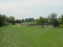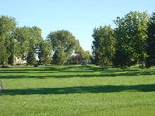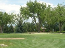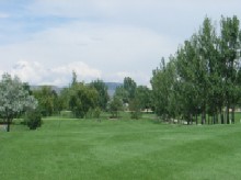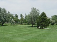 Hole 3 is a little longer than the first hole, and so you want to try for a little distance, but you don’t want to give up straightness.  The driving range on the right is still in play, along with another row of bushy pine trees to worry about.  There’s also a humongous cottonwood tree on the right side of the fairway that manages to annoy nearly everyone except left-handers that hit a draw.  There’s lots of trouble on the left side too, including out-of-bounds if you hit it way far left.  So again, let it take three shots to reach the green, as long as you don’t wind up in the trees.  The green on #3 is very tricky.  It’s pretty steep at the front, and you really want your first putt to be up that hill, not down it.