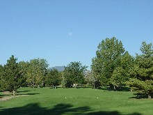 Hole 1 is a par 4.  It’s fairly short, and you don’t need much distance off the tee, so the important thing is to hit the fairway.  The driving range is on the right behind a row of trees.  It’s not out of bounds - if you go into the driving range, you can certainly play your second shot from there.  But it is a driving range - watch your head…  If you hit a slice, the ball will often get hung up in the trees, which is no fun.  On the left of the fairway, there are lots of trees too.  If you get lucky there are some good lies in the woods on the left, with open lines to the green.  But there are more places where you’ll be stuck in jail, and have to chip sideways to get back to the fairway.  So the whole point of this dissertation about trees is to suggest that you take it easy off the first tee, and hit a club that you’re confident will go straight, even if it’s only a seven iron.  Two seven irons and a wedge will easily reach the green.  Once you get to the green, there are some tricky undulations, but generally it’s tilted from back left to front right.  On your approach shot, remember that it’s far better to be short than long.  If you go long, the chip shot coming back is very very difficult (plus you’ll have to put up with dirty looks from the people you almost hit, who are standing on the second teebox behind the green).
